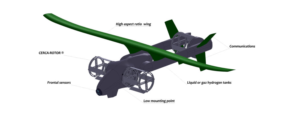 The XF-LR is a Long-Range drone, designed to stay in flight for long periods of time, tanks to its low drag design and hydrogen tanks. It features 3 CERCA-ROTORS® that allow it to perform vertical take-offs and landings, on inclined surfaces as well as conventional pads.
